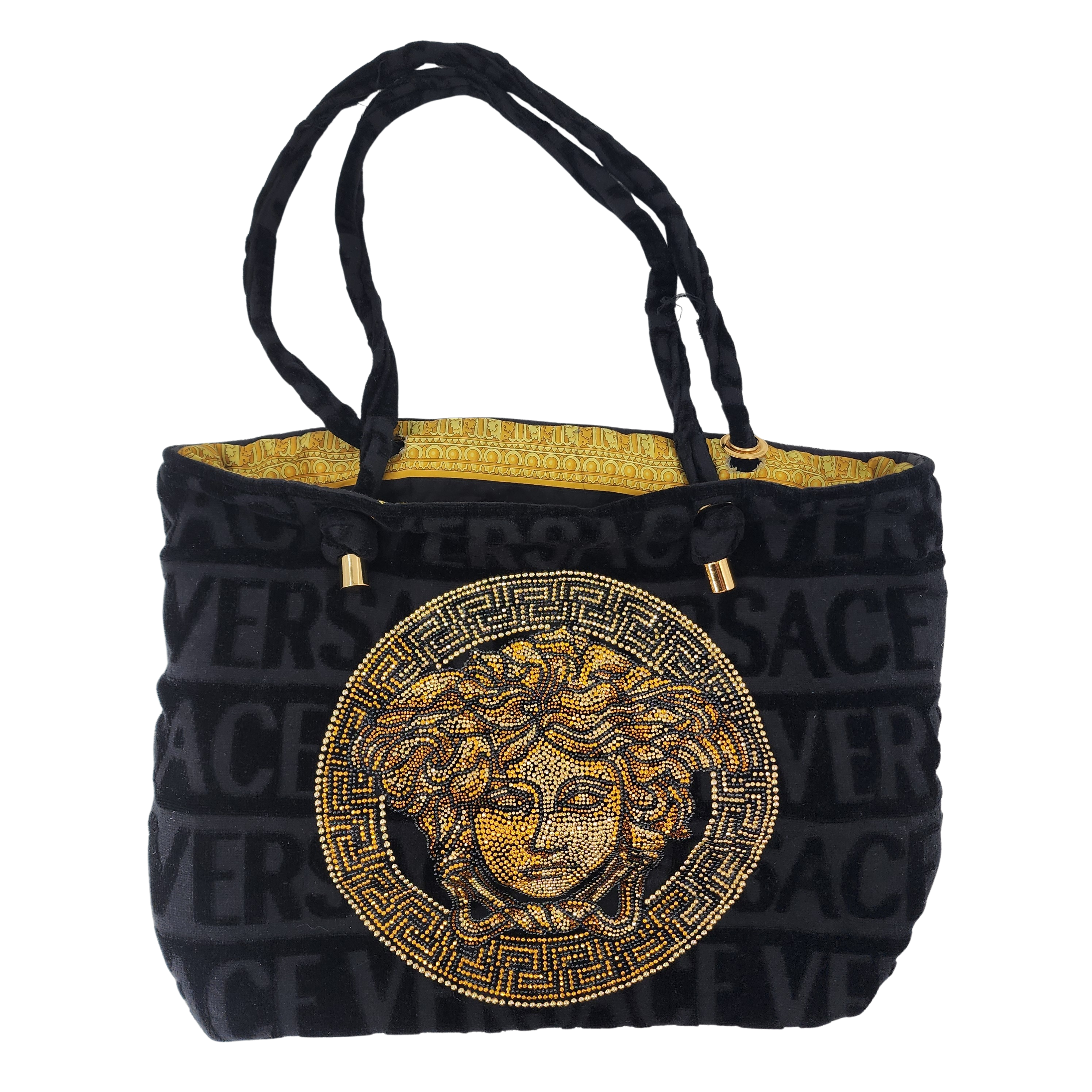 Versace Icon Towelling Tote Bag – One Size – luxury designer tote crafted from plush towelling fabric featuring the iconic Versace Medusa detailing. Shop this exclusive Versace bag on sale today for a bold, elegant, and statement-making look.