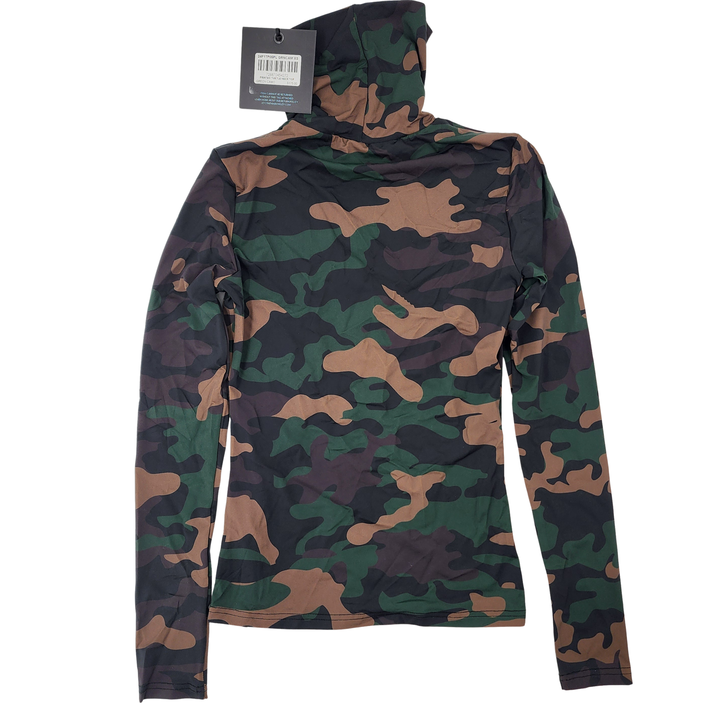 This Cynthia Rowley top features a camouflage print, stretch jersey, roll neck, and long sleeves.