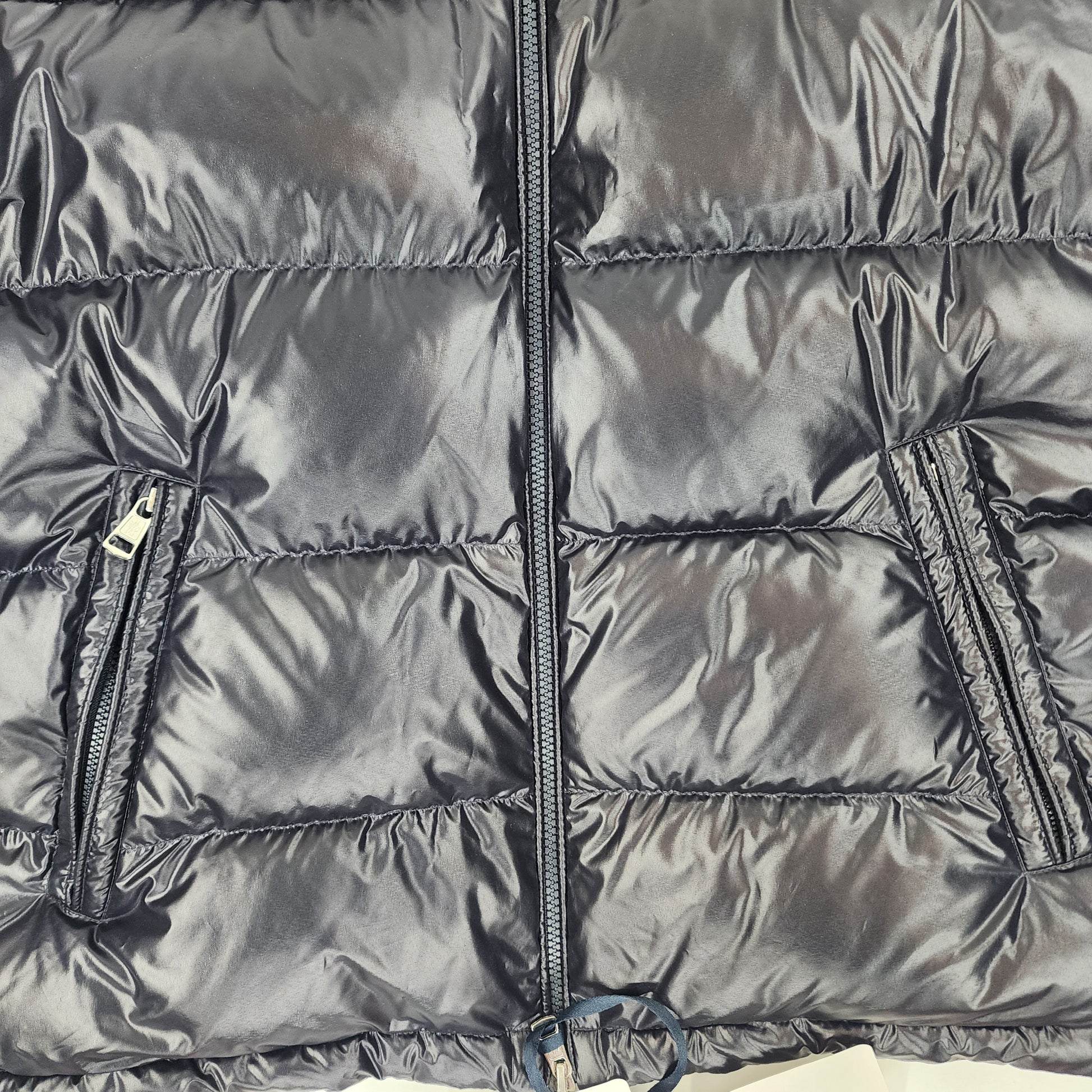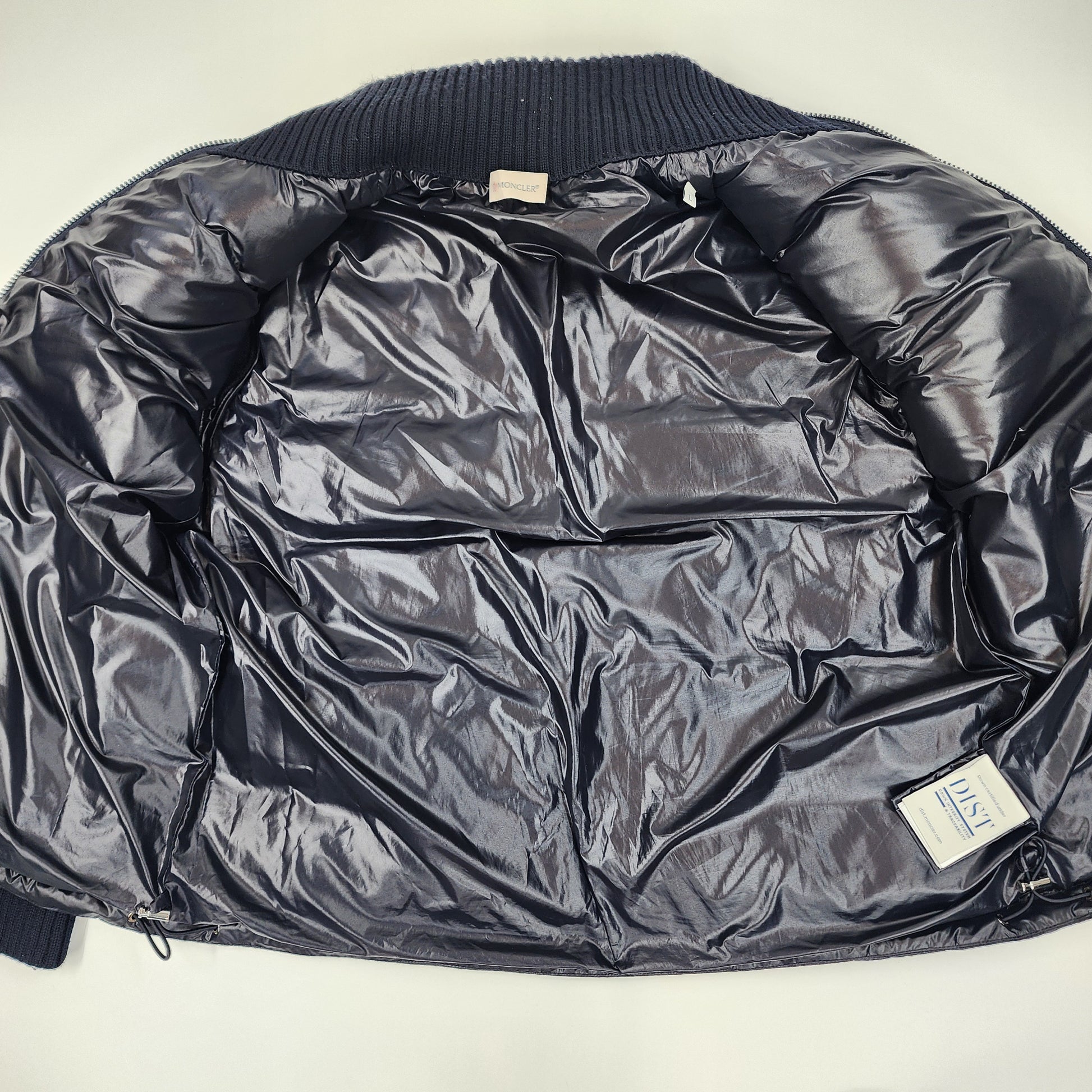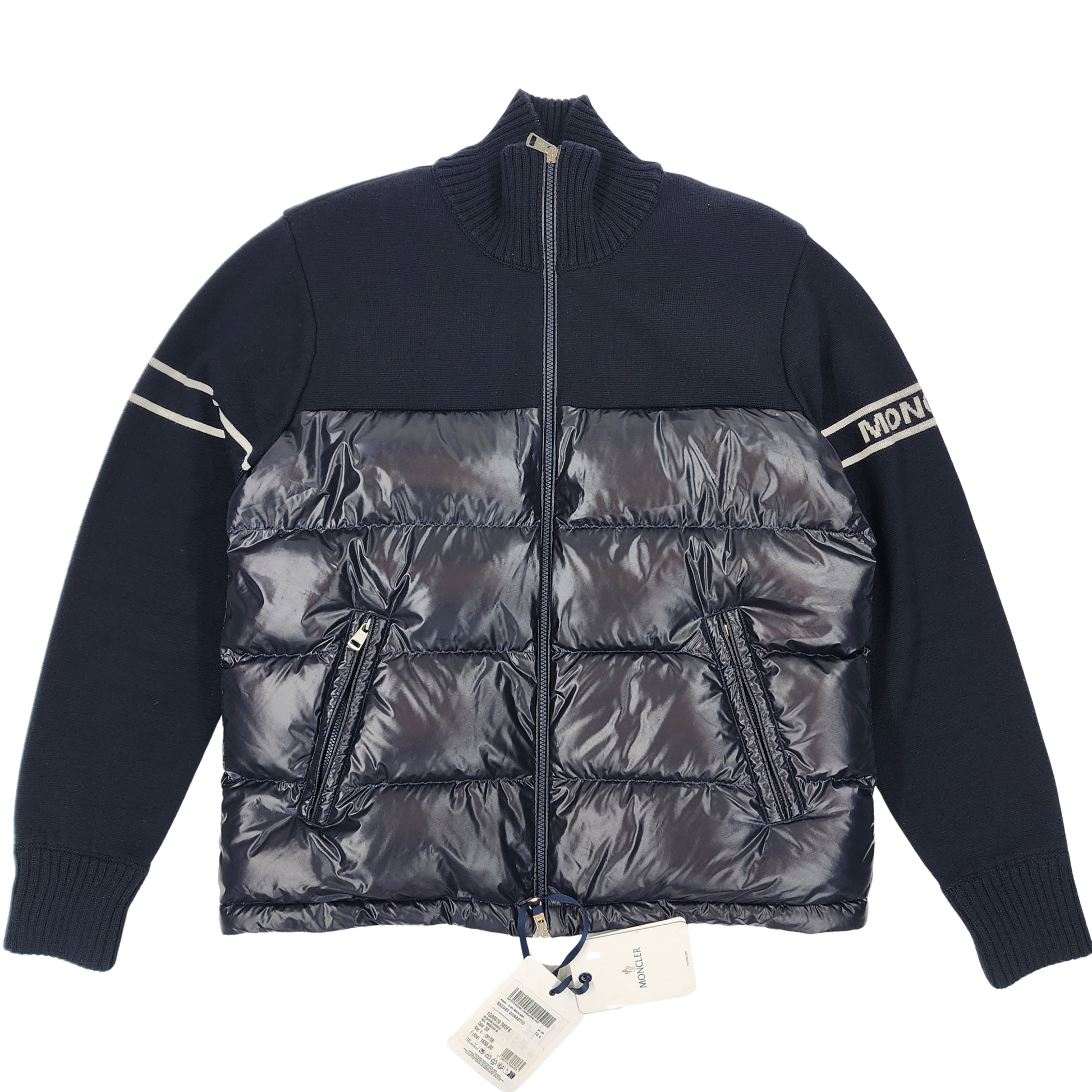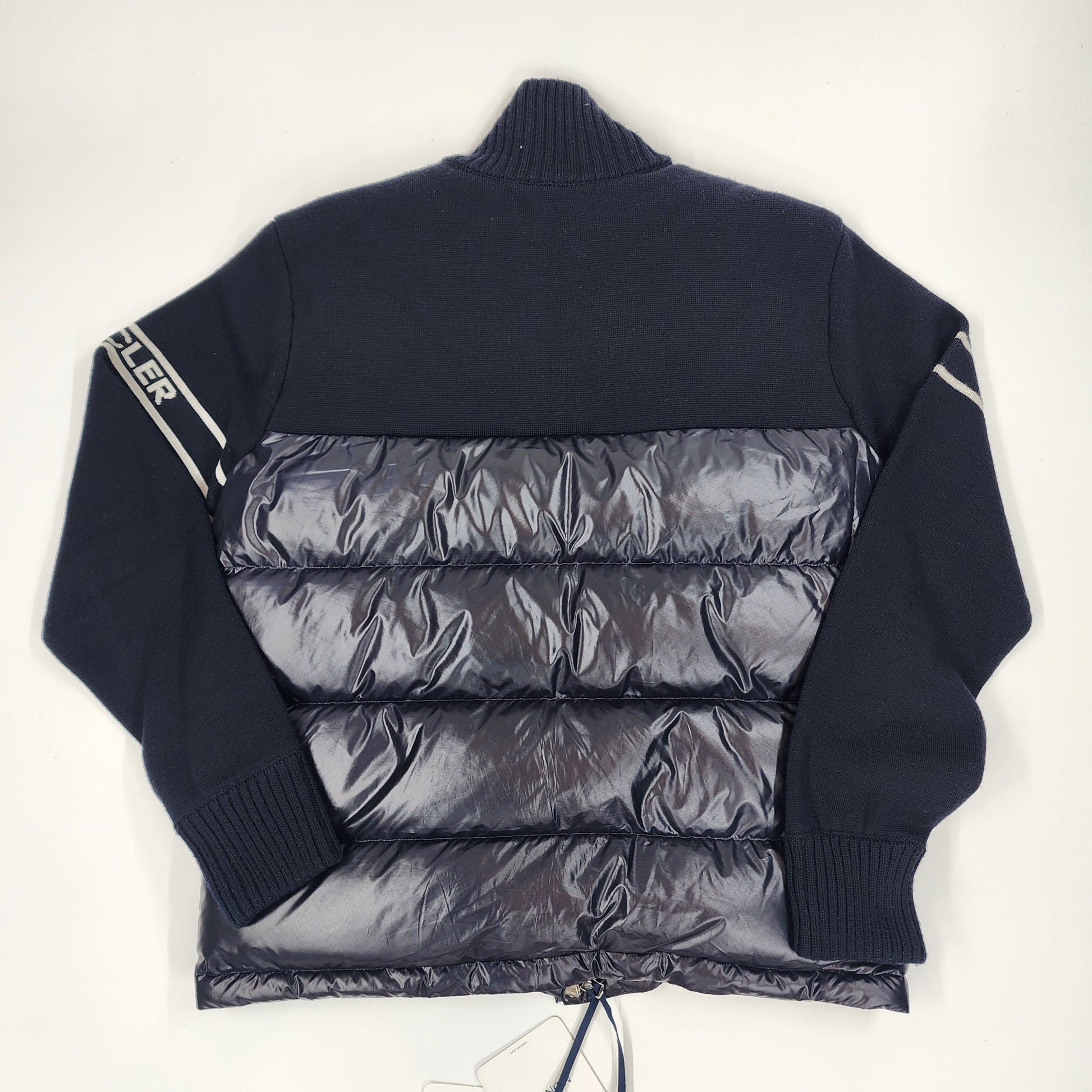 Moncler Navy Unisex Padded Cardigan/Jacket – Size L. Luxury designer outerwear combining lightweight down padding with premium knit panels for warmth and style. A versatile Moncler essential, perfect for men and women seeking high-end fashion, timeless layering, and authentic luxury streetwear.